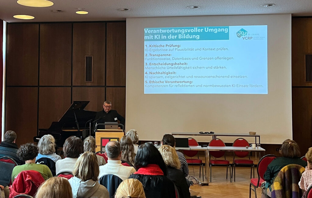 „KI und Bildung – zwischen Effizienz und Werteorientierung“ lautete der Titel der Keynote von Professor Dr. Konrad Faber vom Virtuellen Campus Rheinland-Pfalz, die er am 19.11.2025 auf dem Oberrheinischen Lehrkräftetag im Kloster Neustadt an der Weinstraße gehalten hat.